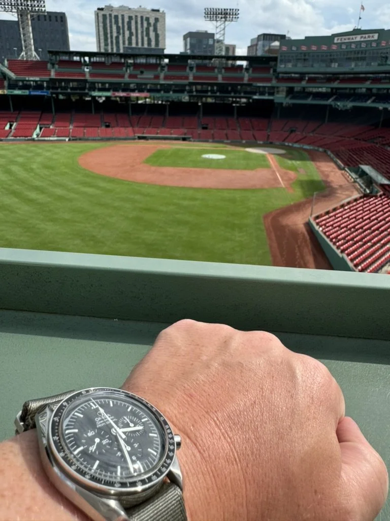 Boston is a good-looking city. The next day was to be spent at the Boston Public Garden, pub crawling, some sightseeing and then touring Fenway. As a full-blown tourist does, we rode the swan boats in the park. I suppose you almost have to do the Cheers bar if it’s your first time in Boston, so that box was checked off as well. The Fenway Park tour was the highlight of the trip for me. I grew up loving baseball and being able to sit atop the green monster with my son was a memorable moment. The stadium monuments famous homerun balls that have dented its green skin which is a must-see if you are a baseball fan. The Fenway Park tour is a non-negotiable must-do. Although the Boston Red Sox did not win the World Series the year we went to the moon, they did beat the Baltimore Orioles the same day the lunar module touched down. July 20th was a good day for Boston, a good day for NASA, and the beginning of a very long Omega marketing campaign.